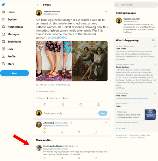"Essa condenação de pernas nuas é um exemplo de porque muitos têm a impressão de que os tradicionalistas são Puritanos loucos obcecados por sexo e 'pureza feminina.'"